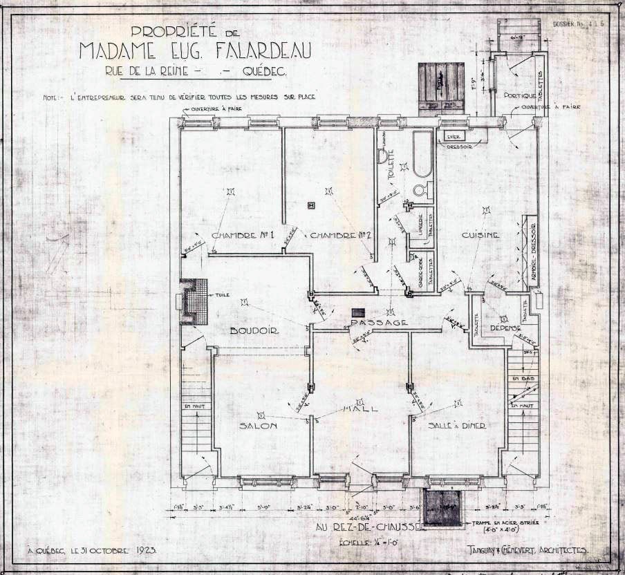 L’approche du projet s’est faite en tout respect des caractéristiques remarquables de la propriété. Érigée pour le ferblantier-couvreur Eugène Falardeau en 1915, le rez-de-chaussée accueillait à l’origine de l’espace d’entreposage, scindé en deux par une porte cochère qui donnait accès à la cour.