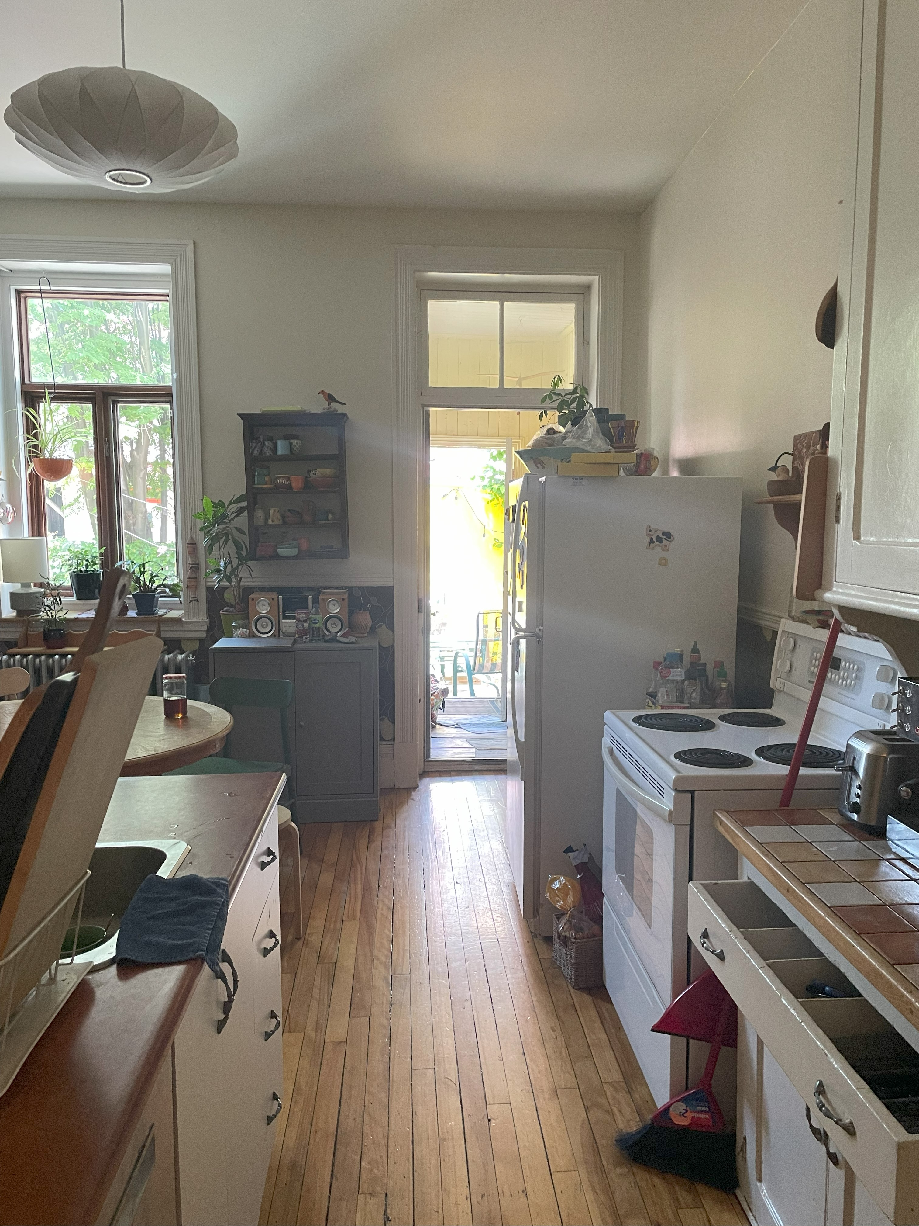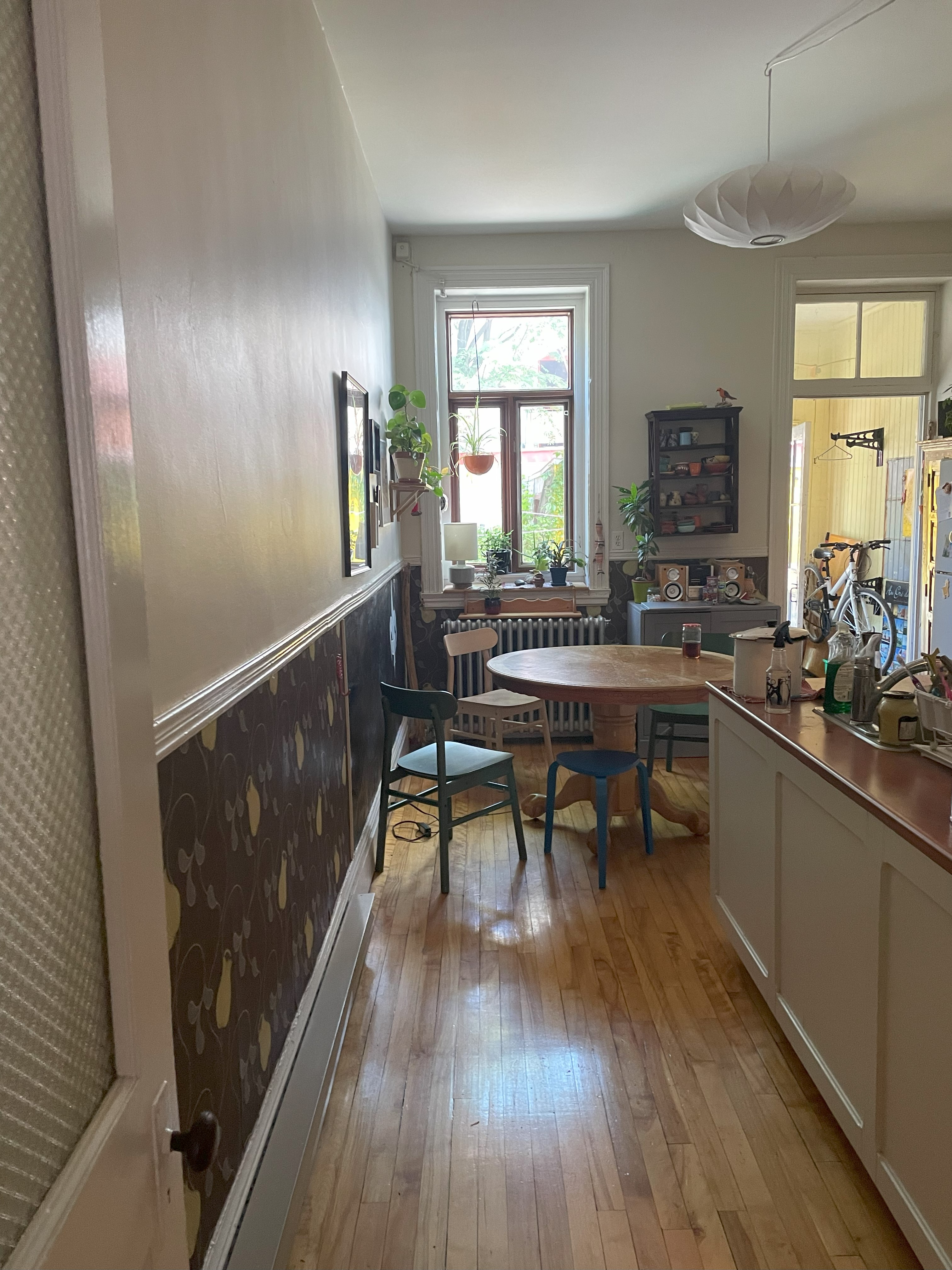 En 1923, Madame Eugène Falardeau (!) mandate l’architecte Raoul Chênevert pour la conversion durez-de-chaussée en logement. La recherche d’archives de la propriété nous a permis de réaliser que le plan du logement est pratiquement identique au plan initial dessiné par l’architecte. Dans la cuisine, les armoires hautes sont celles d’origine, et fêtent donc leur 102e année en 2025. Les colorations sont en phase avec les couleurs historiques du début du 20e siècle. Elle s’accorde au reste de l’appartement, joyeusement coloré par les propriétaires. Un projet à petite échelle, qui montre tout l’intérêt de valoriser le savoir des artisans, encore aujourd’hui.